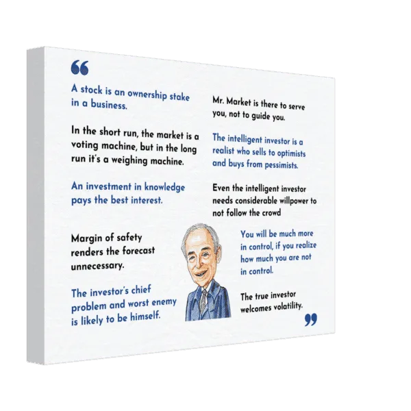 This Ben Graham Top 10 quotes Canvas Print is a daily reminder of his timeless principles. Graham was the father of value investing. and his principles were invaluable for investors, fund managers, CEOs and entrepreneurs. His philosophy influenced legendary investors like Warren Buffett, as well as the Graham group (a group of value-oriented investors that Buffett brought together annually) which included Buffett, Charlie Munger, William J. Ruane, Irving Kahn, Walter J. Schloss, Christopher Browne, Charles Brandes and Ben Graham himself.